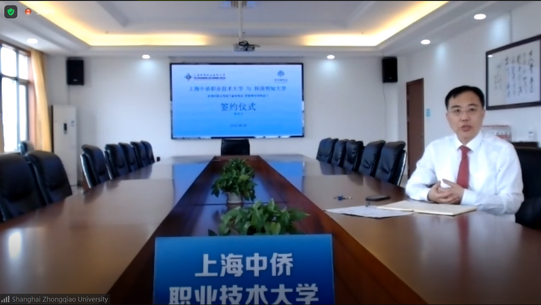 随后,上海中侨职业技术大学校长霍佳震与韩国明知大学副校长宣正源代表两校共同签署了合作协议。双方互致邀请,期待疫情过后能早日实现互访。