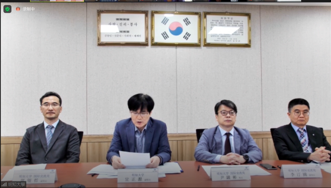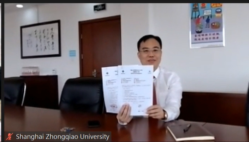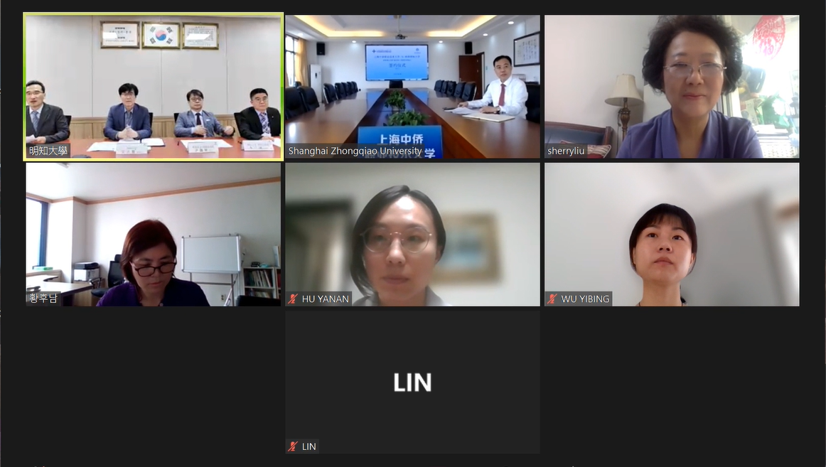 6月9日下午1点(韩国时间下午2点),上海中侨职业技术大学与韩国明知大学通过远程视频会议形式举行合作签约仪式。上海中侨职业技术大学校长霍佳震、副校长刘淑芸、国际交流处副处长胡雅楠、国际交流处职员武怡冰、韩国明知大学副校长宣正源、国际交流处处长尹鐘彬、国际交流处副处长郭银哲、国际交流处副处长李汀國、国际交流处主任金秀炫、国际交流处职员陈思、项目负责人黄后男教授等出席了会议。