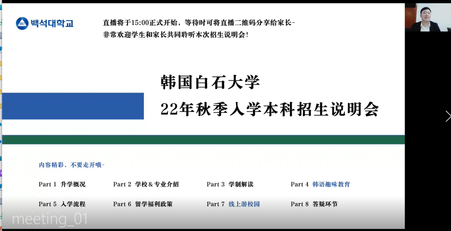 为了促进校际学术和文化交流与发展,2022年5月,我校与韩国白石大学签署友好交流协议。6月10日,韩国白石大学国际交流处主任崔光彬,韩国白石大学中国办公室主任李文俊,韩国白石大学中国办公室老师王琳参与线上宣讲。参与讲座的有国际交流处副处长胡雅楠、国际交流处职员武怡冰、学院部分教师和学院毕业生。