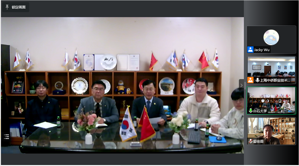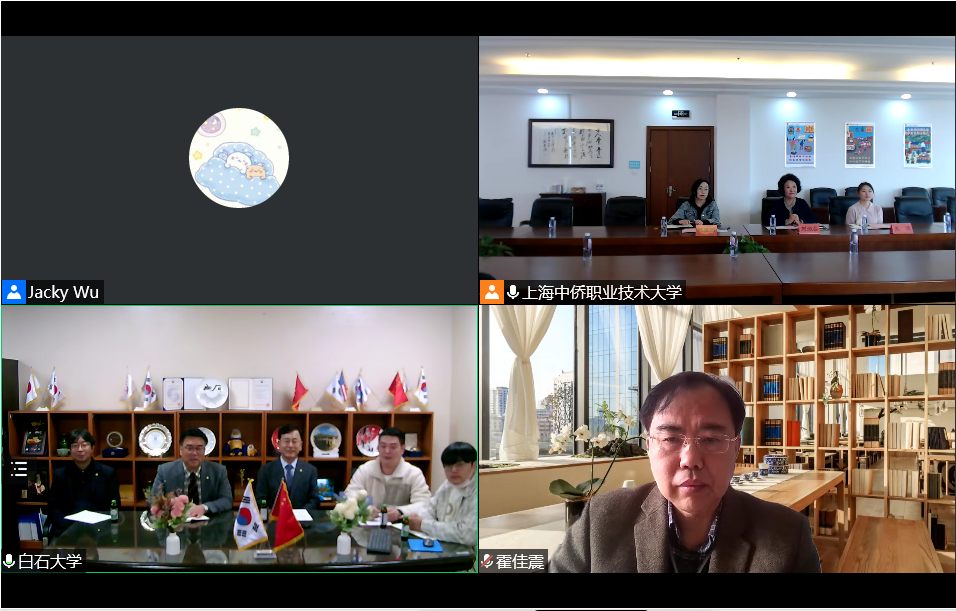11月23日上午10点(韩国时间11点),上海中侨职业技术大学与韩国白石大学通过远程视频会议形式进行合作办学洽谈会。上海中侨职业技术大学校长霍佳震、副校长刘淑芸、国际交流处处长王凌、国际交流处副处长胡雅楠、韩国白石大学副校长李在浚、国际交流处处长金范埈、国际交流处副处长崔世运、国际交流处主任崔光彬等出席了会议。洽谈会由副校长刘淑芸主持。