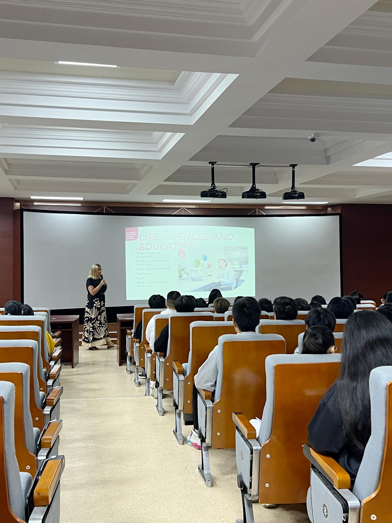 在随后的讲座过程中,王凌处长为学生介绍了学校目前开展的对外交流项目、最新的奖学金政策以及留学项目配套语言课程;Kim Williams介绍了英国公立南威尔士大学的地理位置、学习环境、专业设置等基本情况;Sam Huang和Ella Tang两位老师分别介绍了双方合作的2+1专升本、3+1本升硕等留学项目的具体内容。