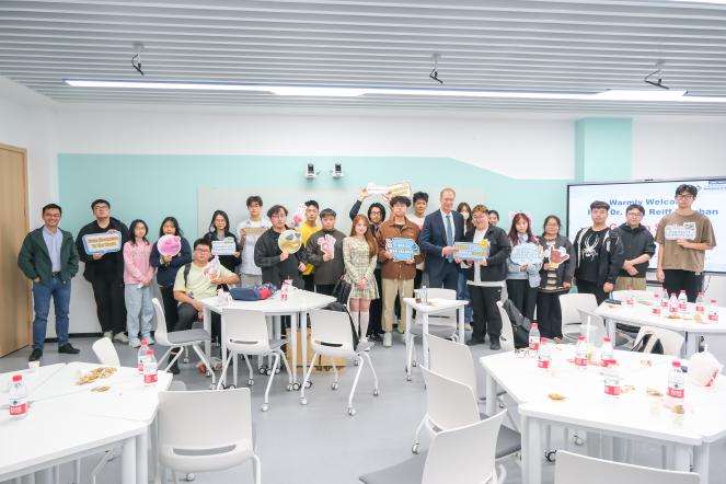 此外,斯特凡教授还在讲座前与即将赴德国学习的学生们进行了一场小型交流会。在交流会上,教授向同学们分享了德国的风土人情、音乐、美食以及留学生政策,并特别强调了学生心理健康的重要性,为学生们提供了宝贵的生活经验和心理支持。