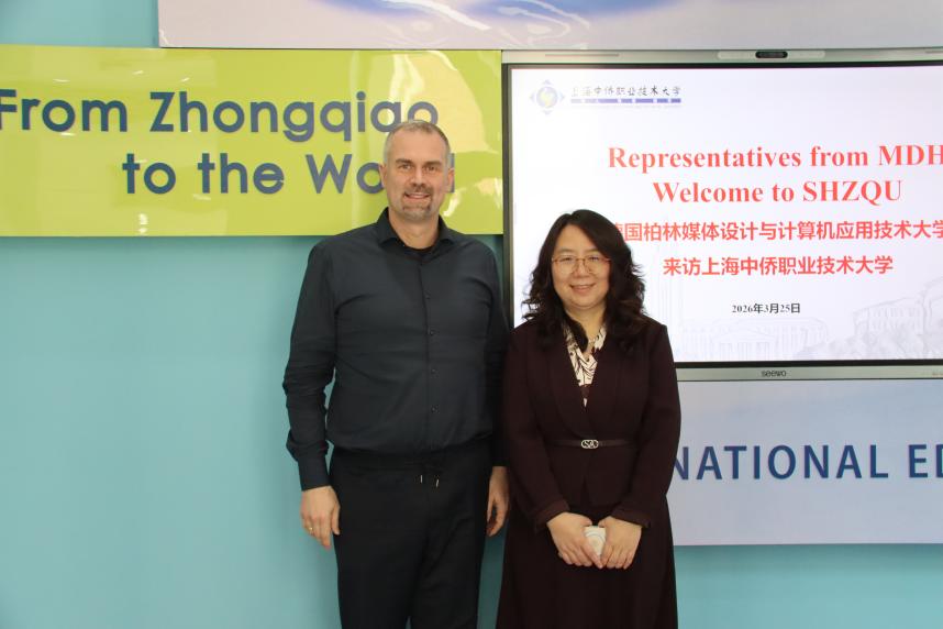 3月25日,德国柏林媒体设计与计算机应用技术大学(Mediadesign Hochschule für Design und Informatik,简称MDH)校长兼CEO Martin Adam、董事会成员陆佳能一行访问上海中侨职业技术大学。校长韩芳、校长助理兼国际部部长严蕙、国际交流处处长王凌等相关负责人出席交流活动。