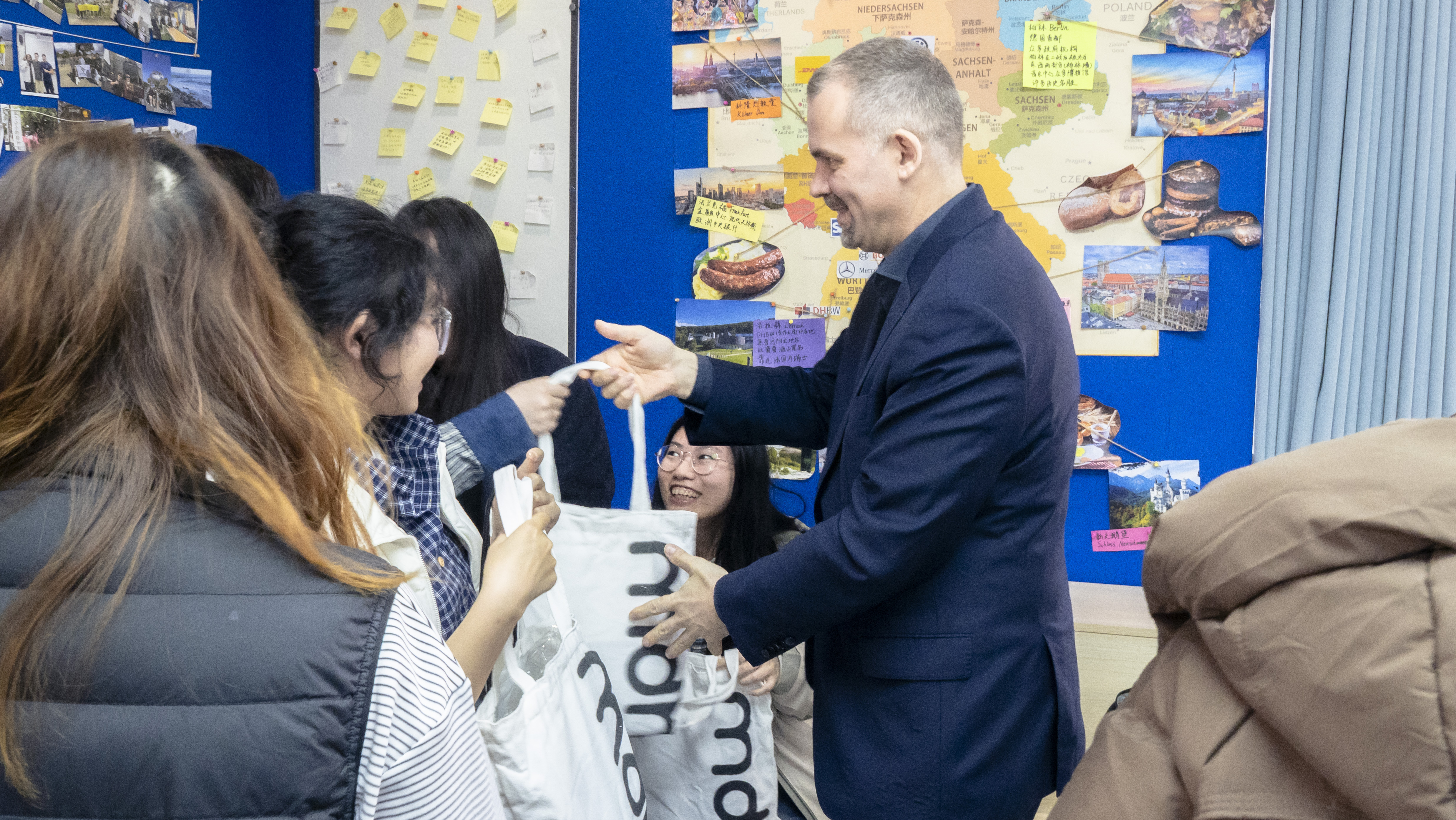此外,Martin Adam校长与即将赴德国MDH学习的27名学生面对面交流,围绕课程安排、专业学习、校园支持、跨文化适应等内容,给予细致的解答和建议。MDH校方为每位同学精心准备了新生大礼包,传递了对MDH联合培养班2026级学生的诚挚欢迎。温暖而真诚的交流,让中侨学子对即将开启的德国留学生活有了更清晰的认识,也进一步增强了他们走向国际舞台、拥抱多元成长的信心与动力。